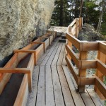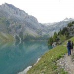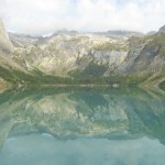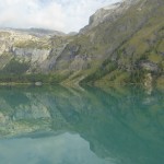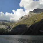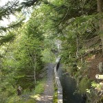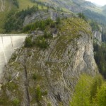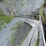 Gemütlich vorbei am Ausgleichsbecken, geht es über eine Brücke zur “d Stägä” durch Fels und Waldpartien hinauf auf den Glaspass. Ein kurzer und steiler Anstieg – und das gleich am Morgen. Zum Glück sehe ich noch nicht alles. Auf der gegenüberliegenden Seite wird das Safiental von der Sonne langsam geweckt. Die Hänge erscheinen von Minute zu Minute mehr im Sonnenlicht – und der Himmel wird blauer und blauer. Nichts desto trotz muss ich hier rauf.
